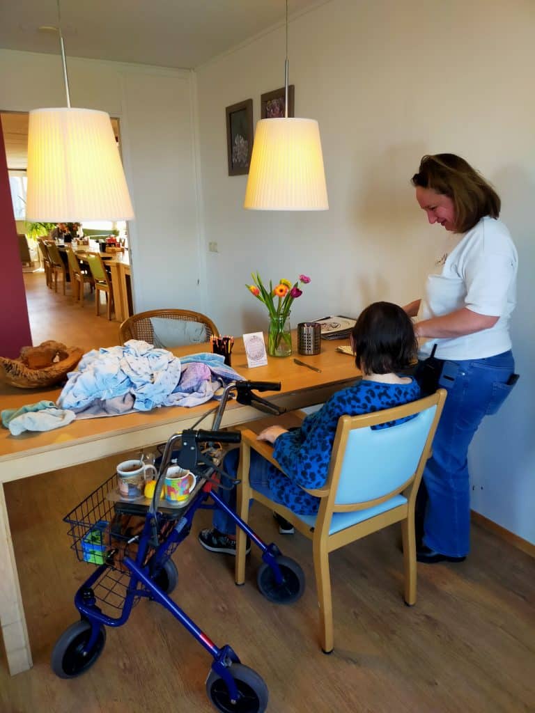 Wat Joyce en Minette meteen noemen als reden waarom ze hier al zo lang werken, is het team. Collega’s zijn op elkaar ingespeeld, nemen werk van elkaar over en vangen elkaar op. Ook bij ingrijpende gebeurtenissen zoals ziekte of overlijden van een cliënt. Dat komt soms voor. “Je gaat niet snel met een onrustig gevoel naar huis,” zegt Minette. “Als jij er niet bent, weet je dat collega’s het overnemen.”